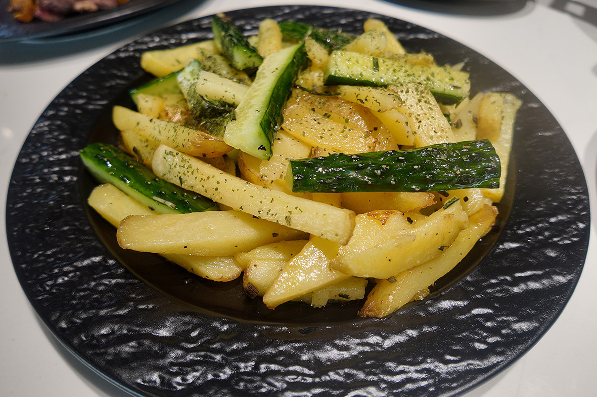 2 potatoes (cut into thick strips), 1 spoon of truffle oil, a little truffle salt (or regular salt + truffle sauce), cooking oil (for frying), parmesan cheese powder (optional), a little chopped parsley.