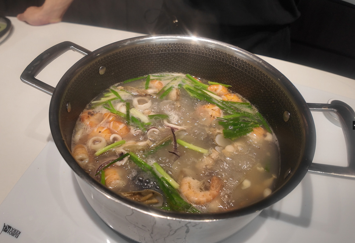 First, cook the shellfish until they open (skim off the foam). Finally, add non-shellfish seafood like squid and cook for 3-5 minutes.